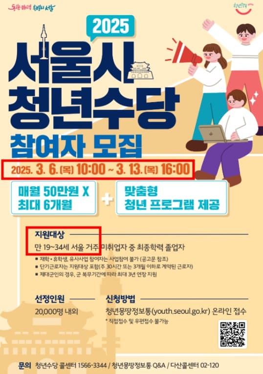 신청기간2025. 3. 6.(목) 10:00 ~ 3. 13.(목) 20:00신청대상1. 주민등록상 서울시에 거주하는 최종학력 졸업 후 미취업 상태인 청년2. 만19세~34세 (출생일이 1990년 3월 1일~2006년 3월 31일인 자)※ 의무복무