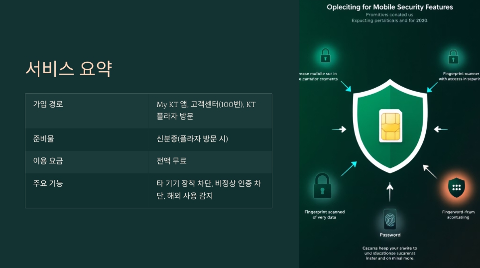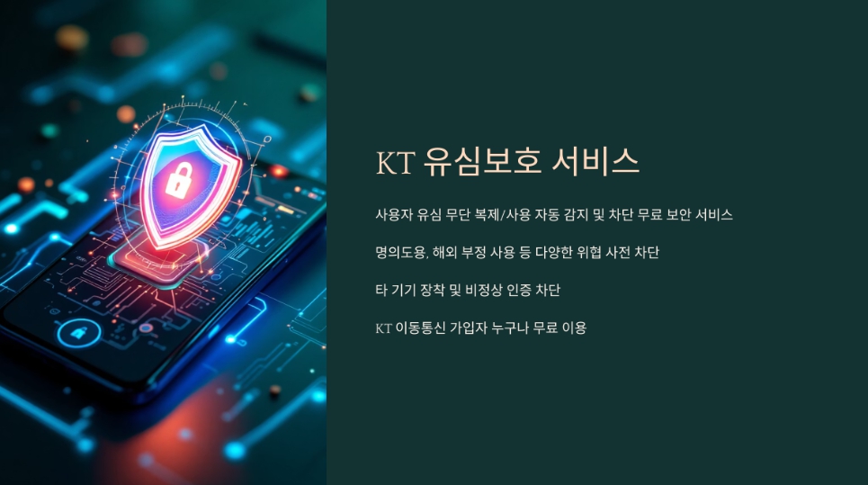 KT 유심보호 서비스는 사용자의 유심이 무단 복제되거나 다른 기기에서 사용될 경우 이를 자동으로 감지하고 통신을 차단해주는 무료 보안 서비스입니다. 특히, 명의도용과 해외 부정 사용 등 다양한 위협으로부터 사전 방어가 가능합니다.