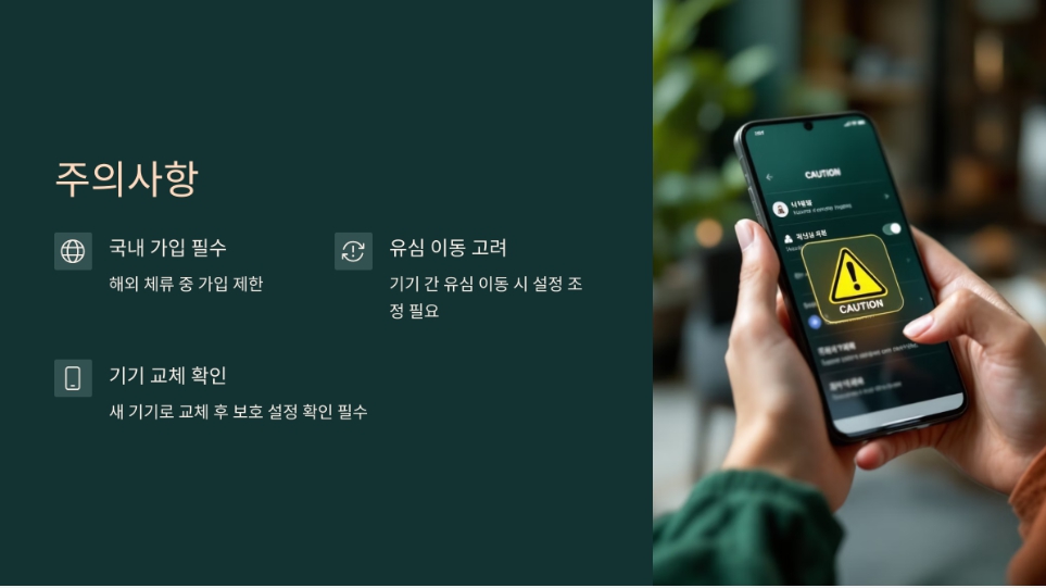 - 타 기기 장착 차단: 내 유심이 다른 스마트폰에 삽입될 경우 즉시 통신 및 데이터 차단