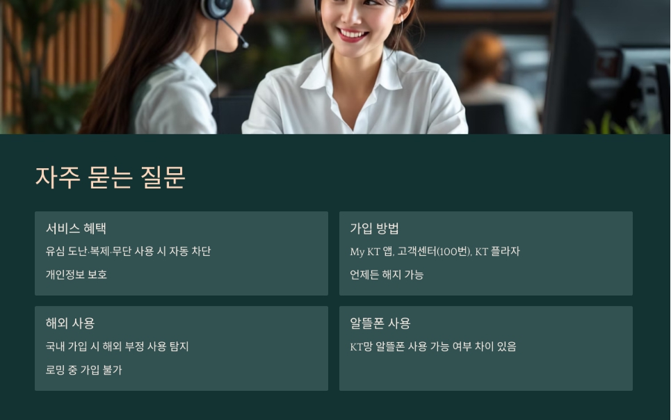KT 유심보호 서비스는 가입만 해두어도 큰 보안 위협을 막아주는 필수 기능입니다. 지금 바로 My KT 앱을 실행하거나 100번으로 전화해 유심보호 서비스를 등록하세요. 해외 출국 전이라면 미리 가입해 두는 것이 안전합니다.