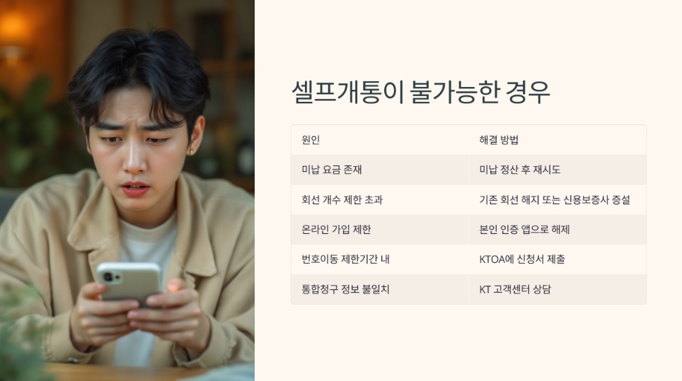 위 조건을 모두 충족해야만 셀프개통이 원활하게 진행되며, 미리 준비하면 개통 속도를 단축할 수 있습니다.