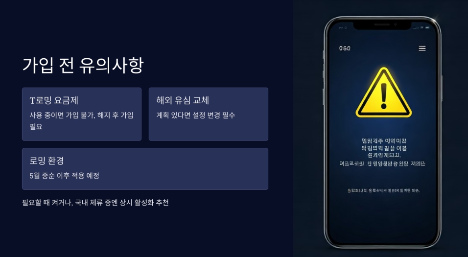 - T로밍 요금제 사용 중이면 가입 불가 → 해지 후 가입 필요