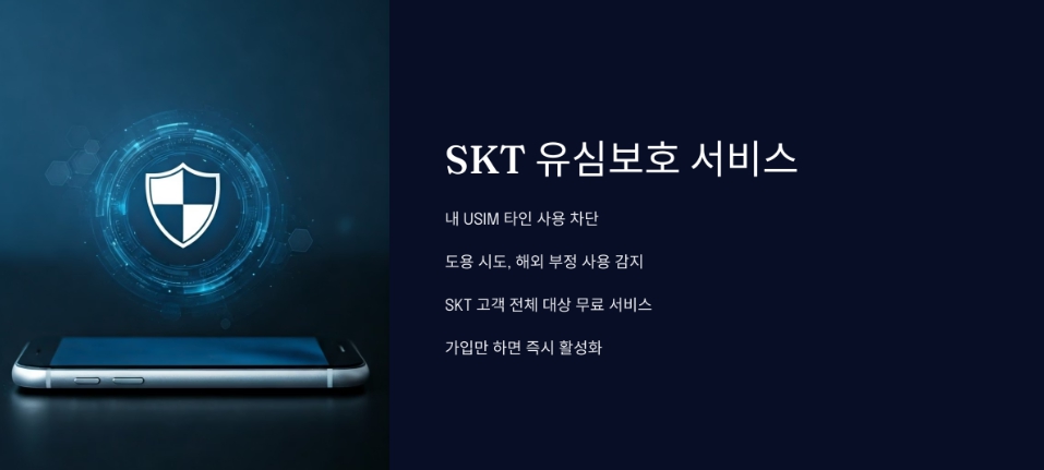 SK텔레콤의 유심보호 서비스는 내 USIM이 타인이 임의로 사용하는 것을 차단하고, 도용 시도나 해외 부정 사용까지 감지하여 차단해주는 무료 보안 기능입니다.