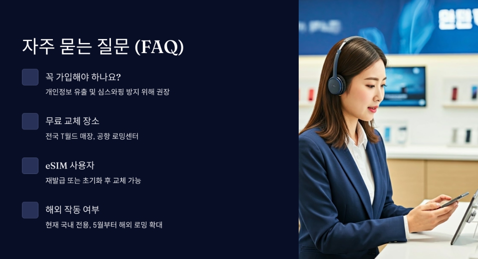 | 유심 무료 교체 | T월드 매장, 공항 로밍센터 | 신분증 + 기존 단말기 | 무료 |