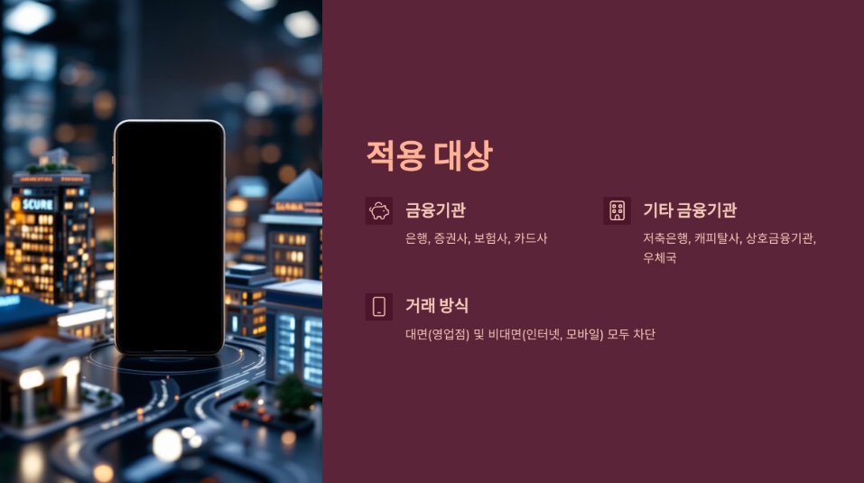 | 적용 대상 | 은행, 증권사, 보험사, 카드사 등 대부분의 금융기관 |