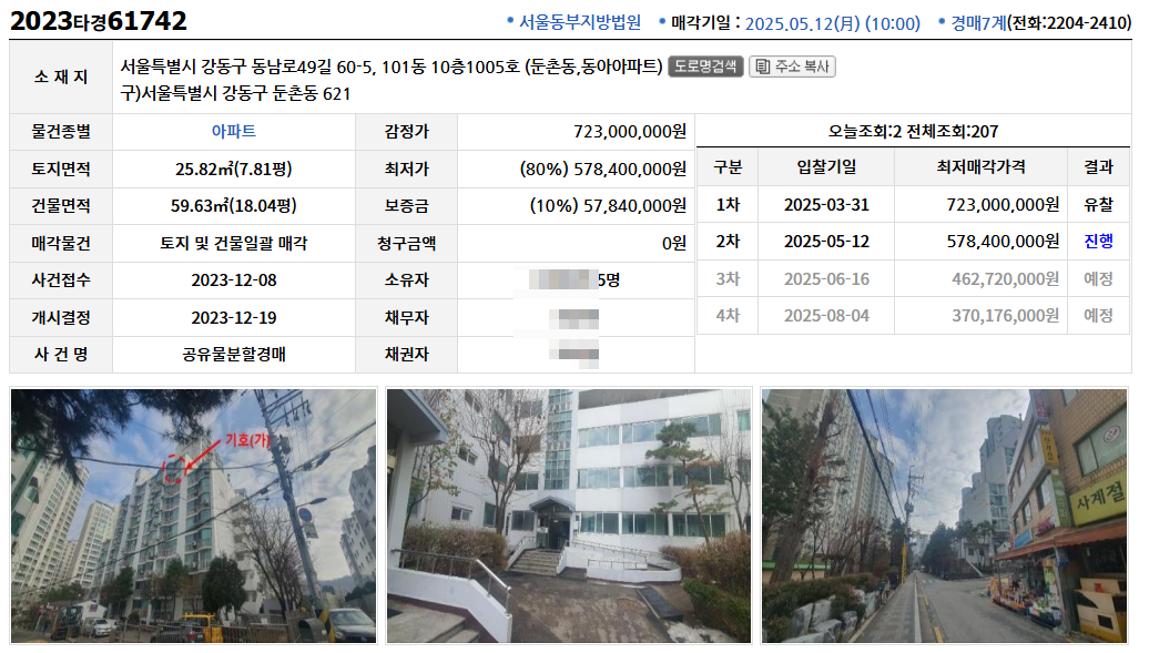 이 경매는 공유물 분할경매인데 이것은 형식상 경매로 해당 아파트의 지분권자들이 경매를 통해 자기 지분만큼 돈을 받아가기 위한 방법입니다. 이 물건은 아마도 상속 혹은 증여받은 상황에서 형제들끼리 지분 분할을 위해 하는 경매로 보입니다. 그렇게 생각하는 이유는 소유자, 채무자, 채권자 성이 모두 같아서 그렇게 추측하는 것입니다.