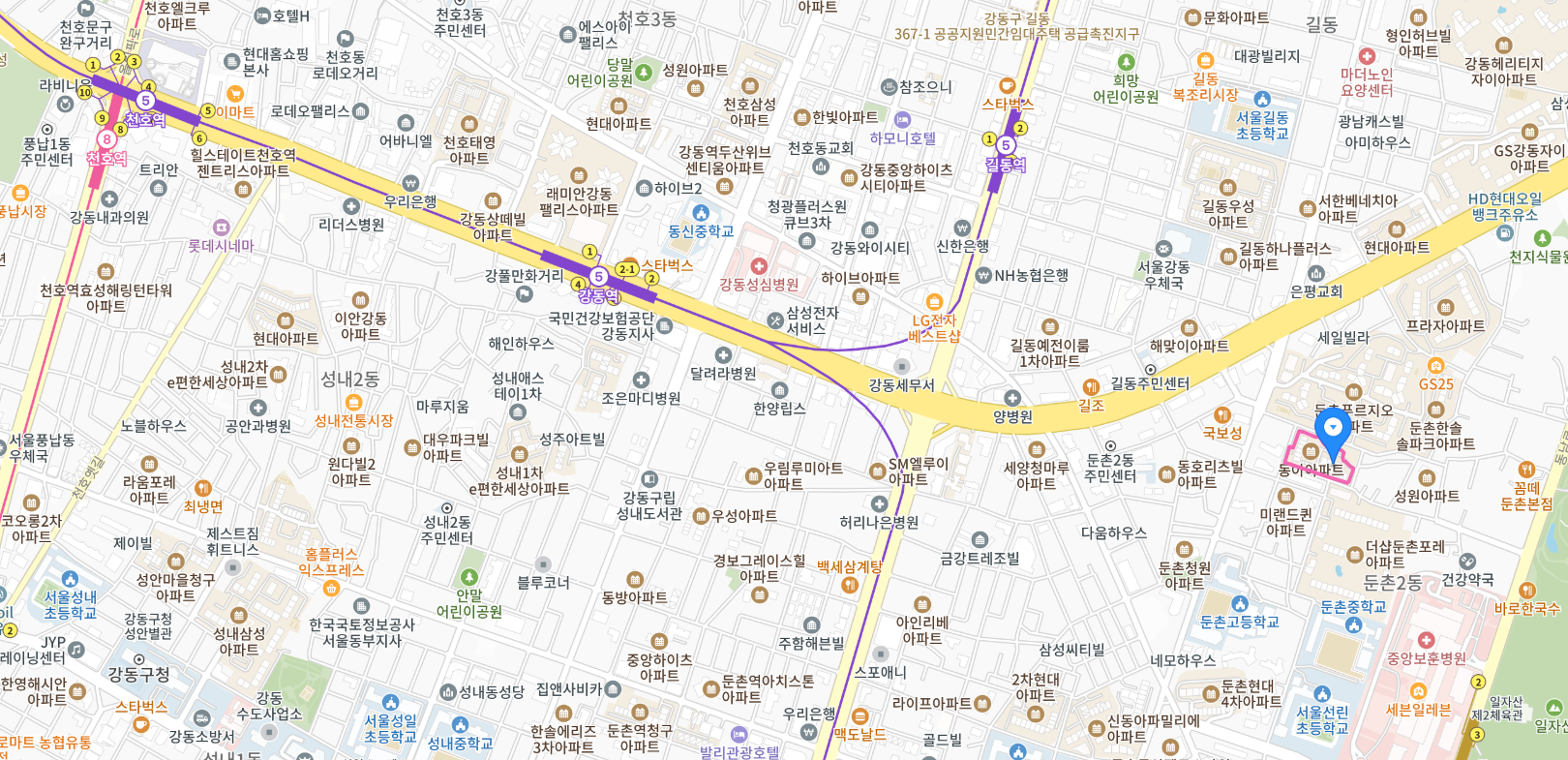 살펴볼 동아아파트는 길동역 약 1km, 둔촌동역 1.3km 거리로 도보로 살짝 부담되는 거리이지만 핵심 노선인 9호선 중앙보훈병원역과 600m 거리로 나쁘지 않은 교통여건을 가지고 있는 아파트입니다.
