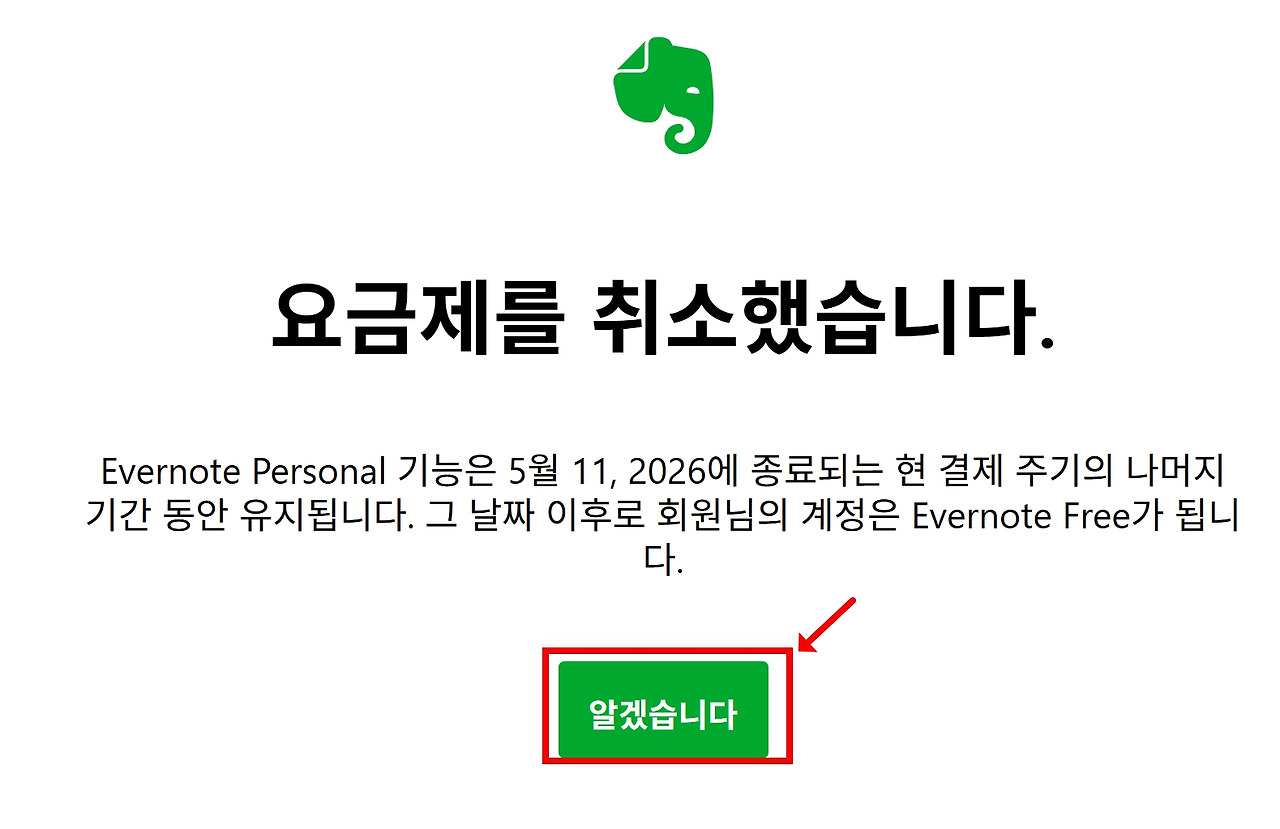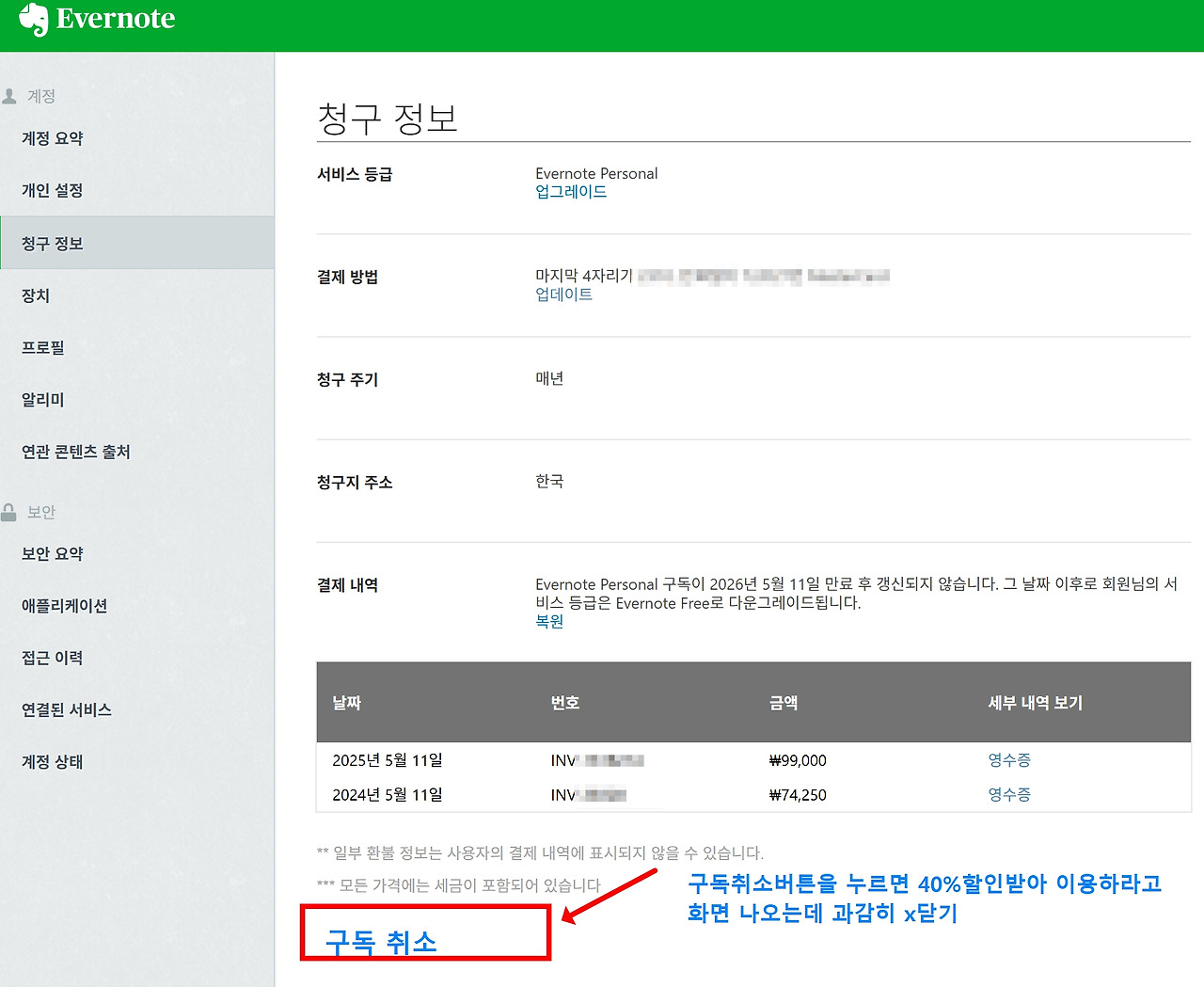 👉 참고: 이때 40% 할인받고 유지하라는 팝업이 뜨는데요, 과감하게 X 눌러서 닫아주세요! 저는 작년에 이거에 현혹되어 연장했다가 올해 10만원 자동연장 두들겨 맞았습니다. 필요하지 않으면, 더 이상 애버노트 안 쓴다고 판단하셨다면 여기에 넘어가지 마시고 그냥 창 닫으시고 구독취소 완료하시면 됩니다.