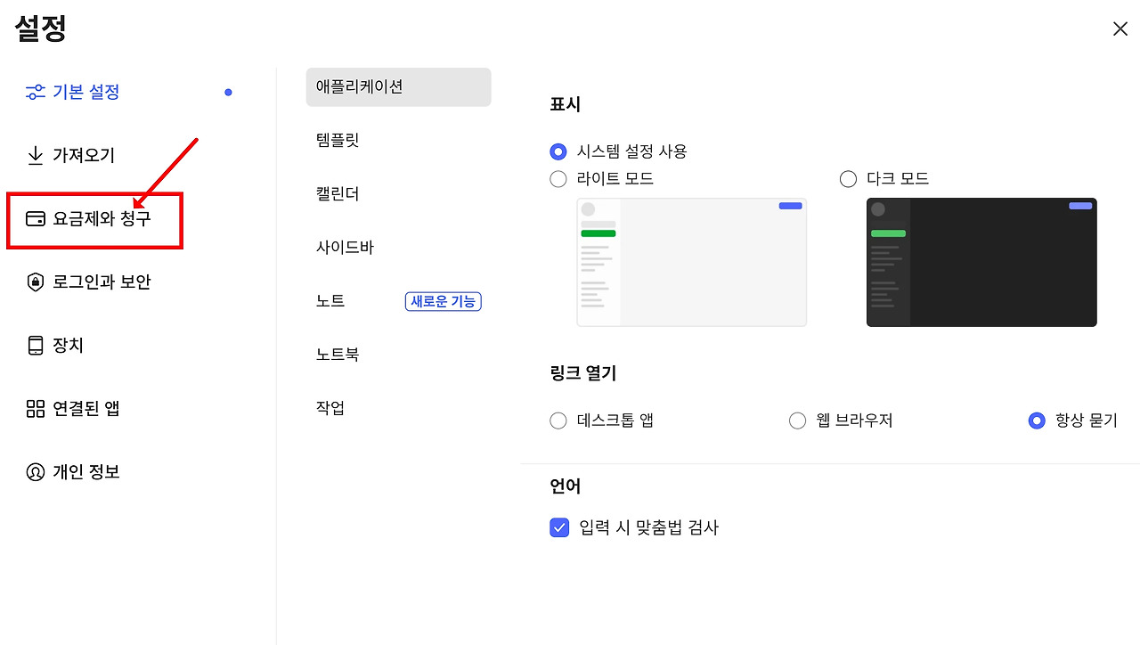 설정 화면 좌측 메뉴에서 ‘요금제와 청구’를 클릭합니다.