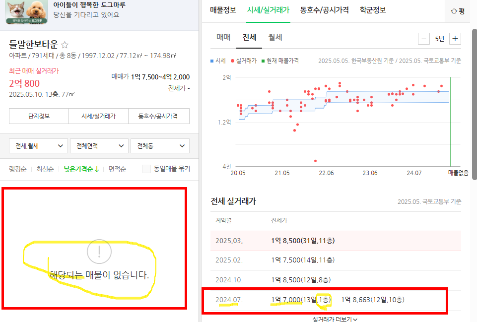 -현재 전월세 매물(실거래가).....전,월세 매물 없음. 24년7월 1층 17,000만원에 전세 실거래.